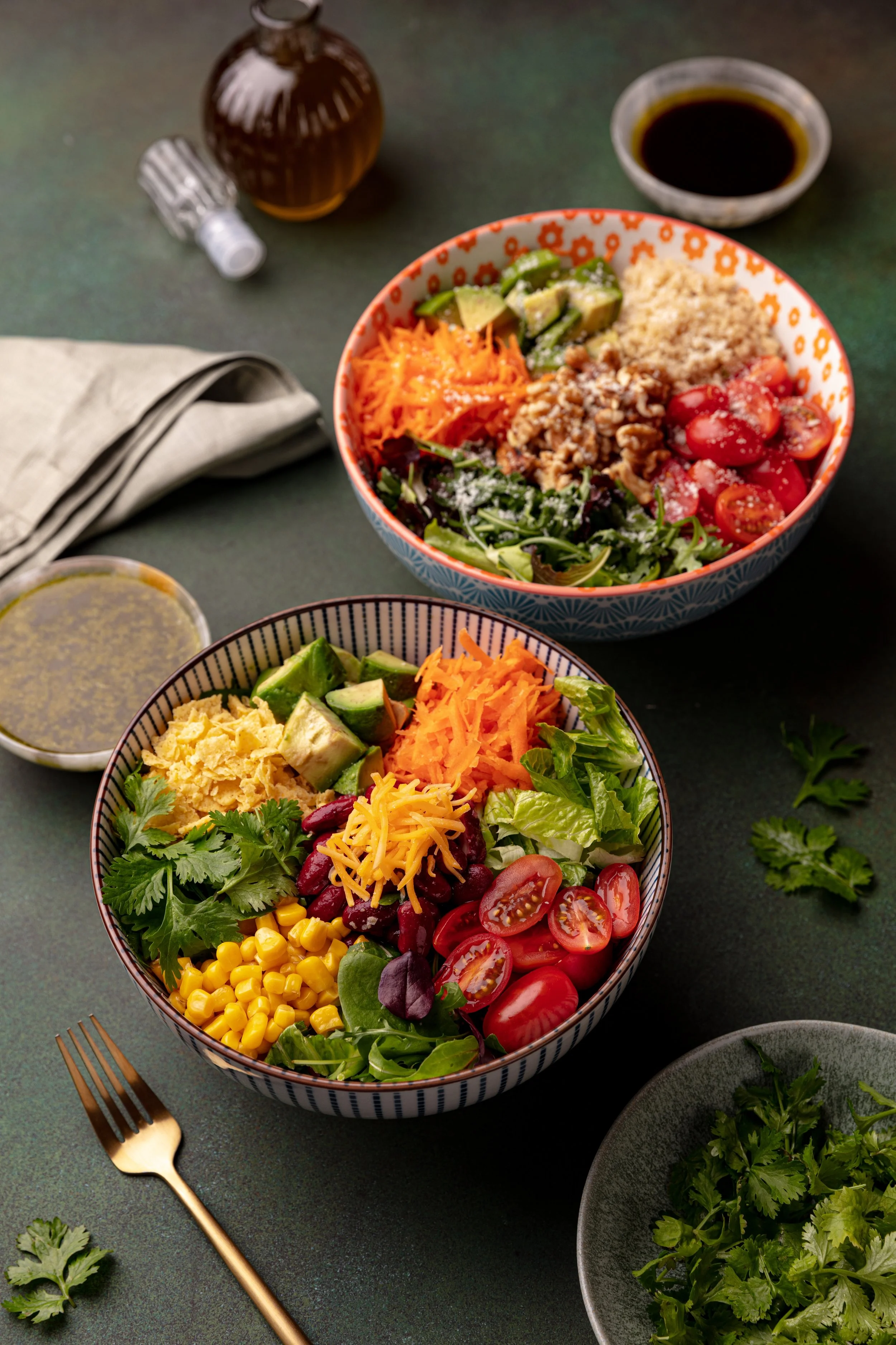 A vibrant selection of fresh, beautifully styled salads, each crafted to highlight color, texture, and taste in every bite.